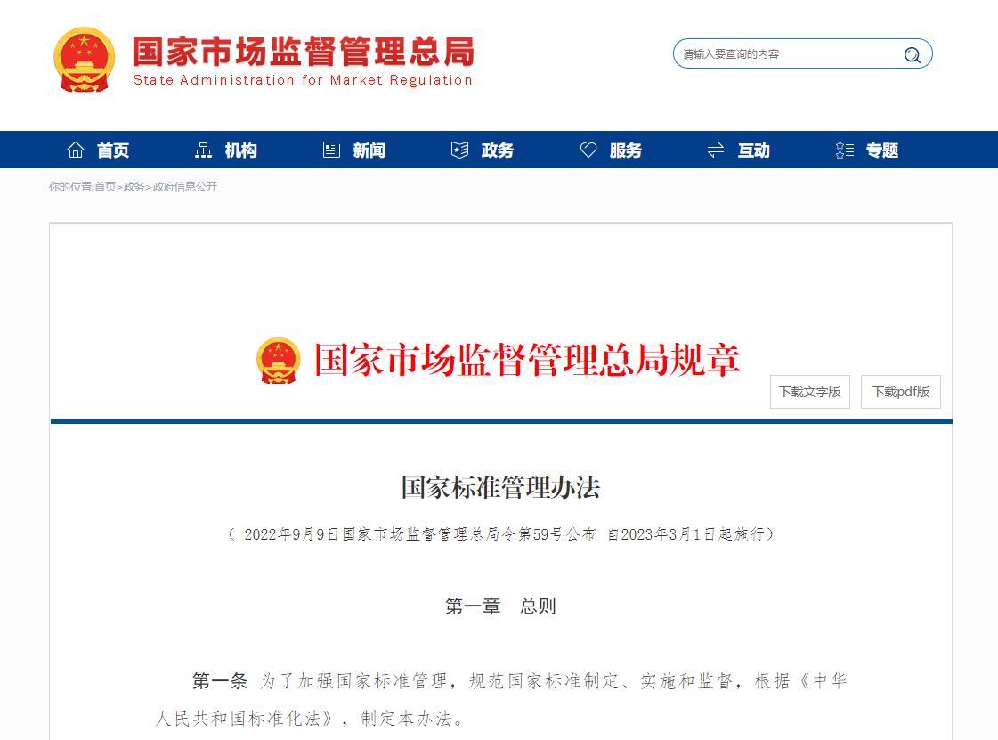2022年9月9日,国家市场监管总局发布《国家标准管理办法》(总局令第59号),对国家标准的制定、实施与监督工作做了规范要求。该办法自2023年3月1日起实施,原国家技术监督局第10号令公布的《国家标准管理办法》同时废止。