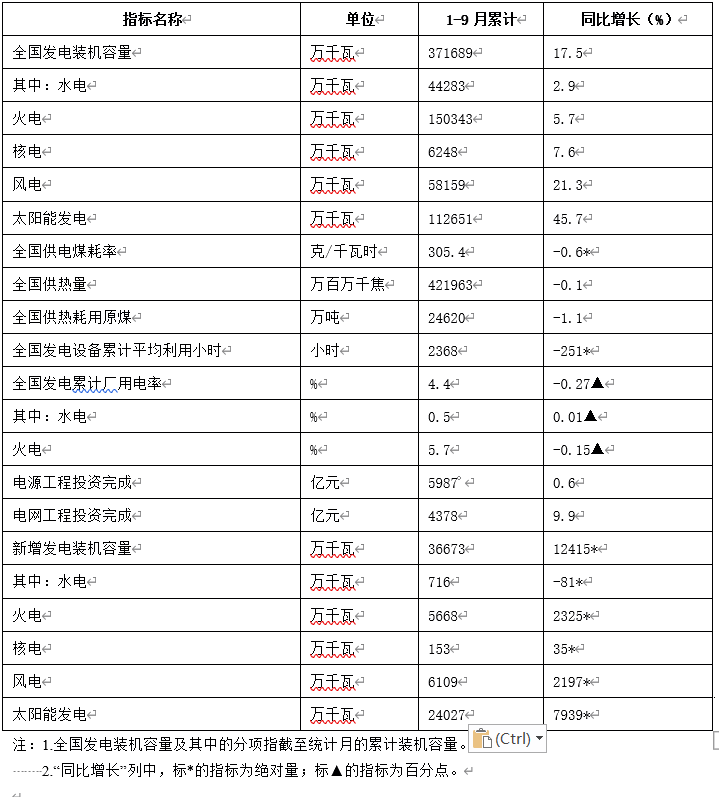10月26日,国家能源局发布1-9月份全国电力工业统计数据。